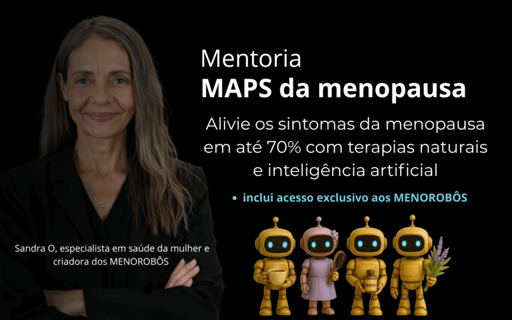 A mentoria MAPS da Menopausa é um programa acolhedor e prático, criado por Sandra O para ajudar mulheres a aliviar os sintomas da menopausa com terapias naturais. Você aprende no seu ritmo, com suporte, encontros ao vivo, materiais exclusivos e bônus especiais — incluindo acesso aos MENOROBÔs.